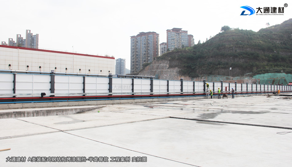 大通建材A類烤漆鋼圍擋-半龍骨款,是一款新型裝配式鋼結構圍擋,圍擋的上下橫梁均為50x50mm深灰色烤漆方通,立柱為300x200mm深灰色烤漆矩形方鋼,2.5米高的每一擋圍擋有8塊(6塊白色、2塊深灰色)烤漆墻板,由左右兩塊墻板與中間暗柱、左右立柱連接組成,安裝得當可以防御10級以上的臺風。了解更多“大通建材A類烤漆鋼圍擋-半龍骨款”的定制生產(chǎn)、配送安裝、價格與規(guī)格等詳情,請直接致電13826562448梁先生 進行溝通