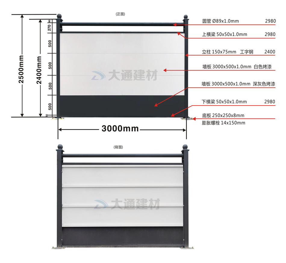 C類裝配式鋼結(jié)構(gòu)圍擋(白色+深灰色墻板)烤漆款 規(guī)格參數(shù)如下圖展示
