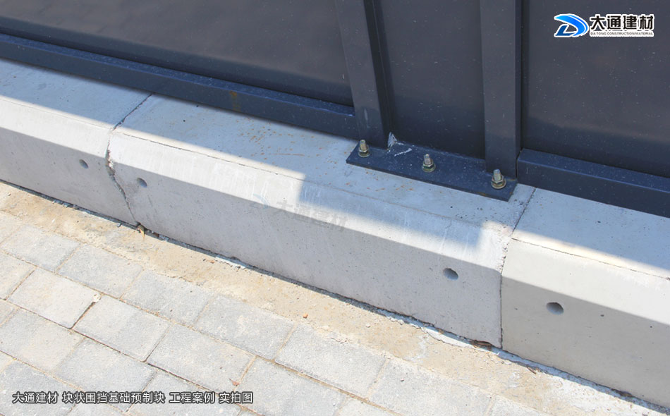 市面上常用的圍擋基礎有兩款:一款是條形圍擋基礎預制塊,另一款是塊狀圍擋基礎預制塊圍擋。大通建材塊狀圍擋基礎預制塊將圍擋立柱固定在圍擋基礎預制塊上,更安全穩固,大通建材圍擋基礎預制塊的常規尺寸(長寬高):1000mmx600mmx300mm
