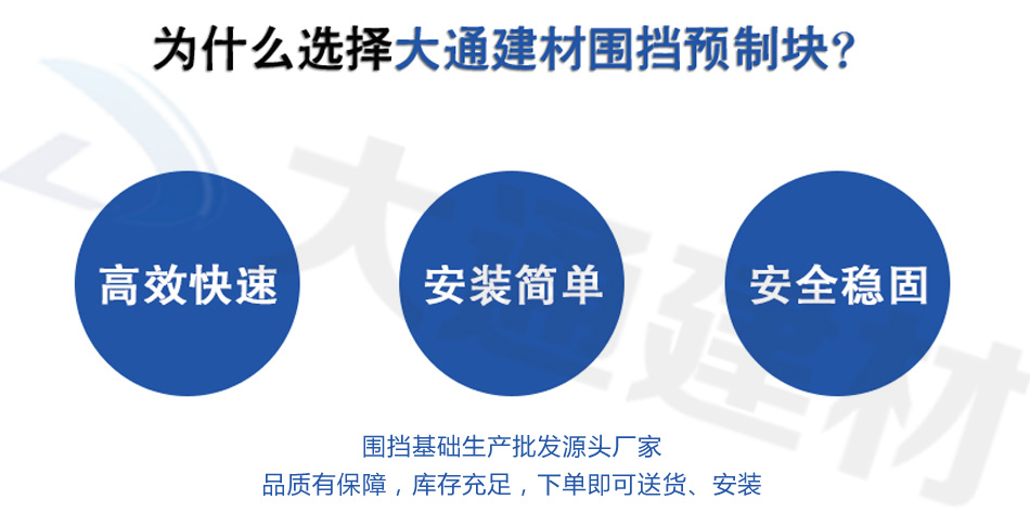 然后我們再來看看塊狀圍擋基礎預制塊的優點是不僅抗傾覆穩定性好,不易發生傾覆,強度高,剛度大,安全穩固,且常規尺寸的塊狀圍擋基礎預制塊有現貨,下單即可以發貨、同時運輸方便,拆裝方便、還能多次周轉使用,即方便又節約成本。