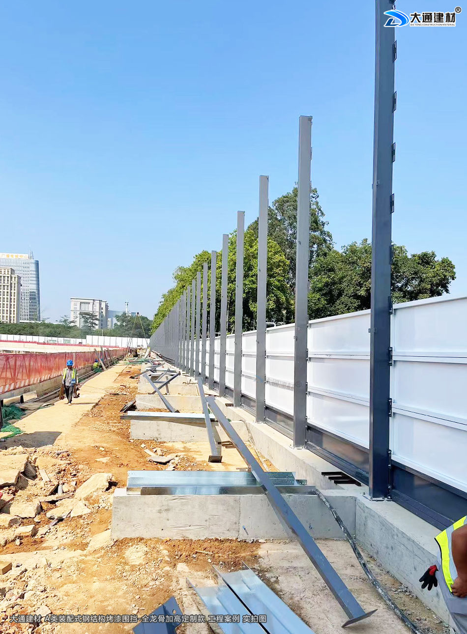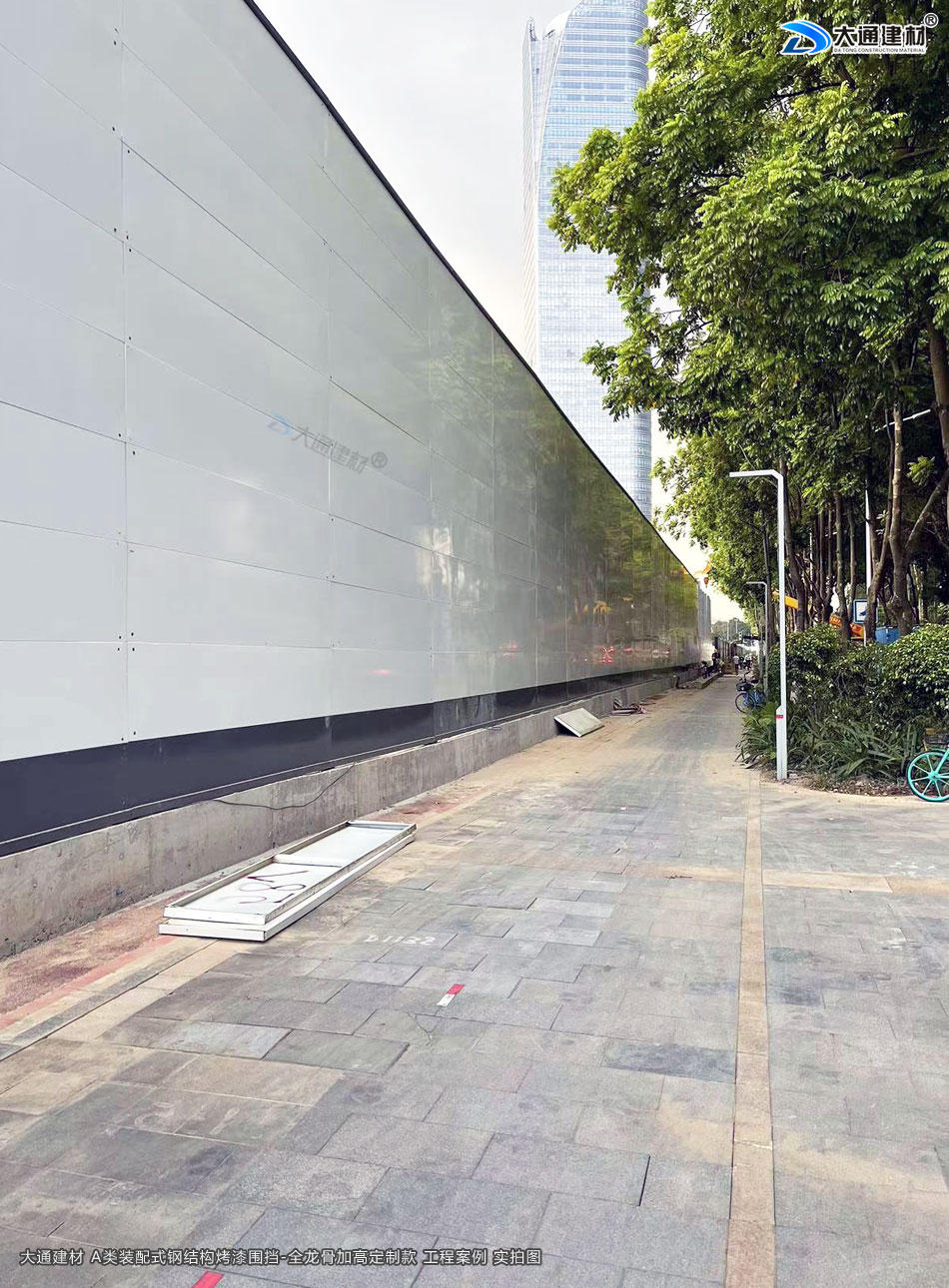深圳大通建材生產的A類裝配式烤漆鋼圍擋全龍骨6米高定制款 適用于各種項目工程:如市政工程建設施工、房地產項目建設施工、地鐵修建項目施工、管網改造、小區改造、城市建設、道路修建施工等工程修施工外圍使用