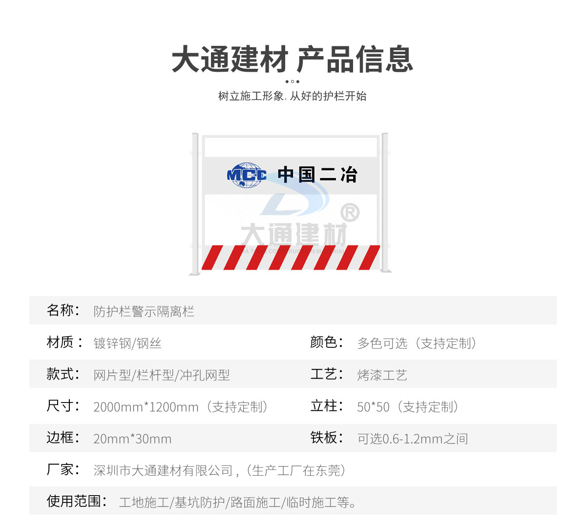深圳市大通建材有限公司是一家集研發、生產、安裝、服務于一體的綜合性圍擋廠家,公司主營產品鋼圍擋、鋼結構圍擋、PVC圍擋、施工圍擋、市政圍擋、工地圍擋、烤漆鋼圍擋,官網:http://m.022fang.cn/ ,銷售熱線:138 2656 2448