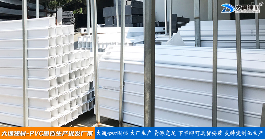 大通建材PVC圍擋立柱、橫管、擋板、斜支撐、橫撐加強筋等部件按照設計與生產標準,尺寸與工藝實現標準化生產和標準化拼接安裝,從而達到高效率生產、快速運輸和拼接式安裝,大大降低了圍擋的采購成本。