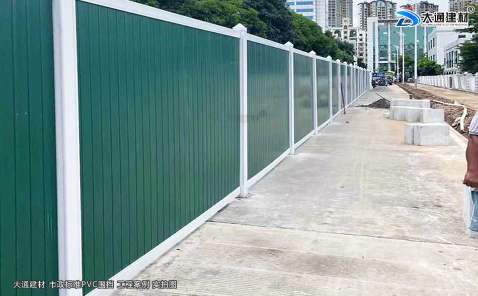 深圳大通建材綠色PVC圍擋表面經烤漆工藝噴涂、鮮艷的綠色、表面光滑,具有美觀環保、安全穩固、經久耐用等特點,適合市政道路建設施工、地產工程項目建設施工管網改造施工、路橋維護施工等工程選用。